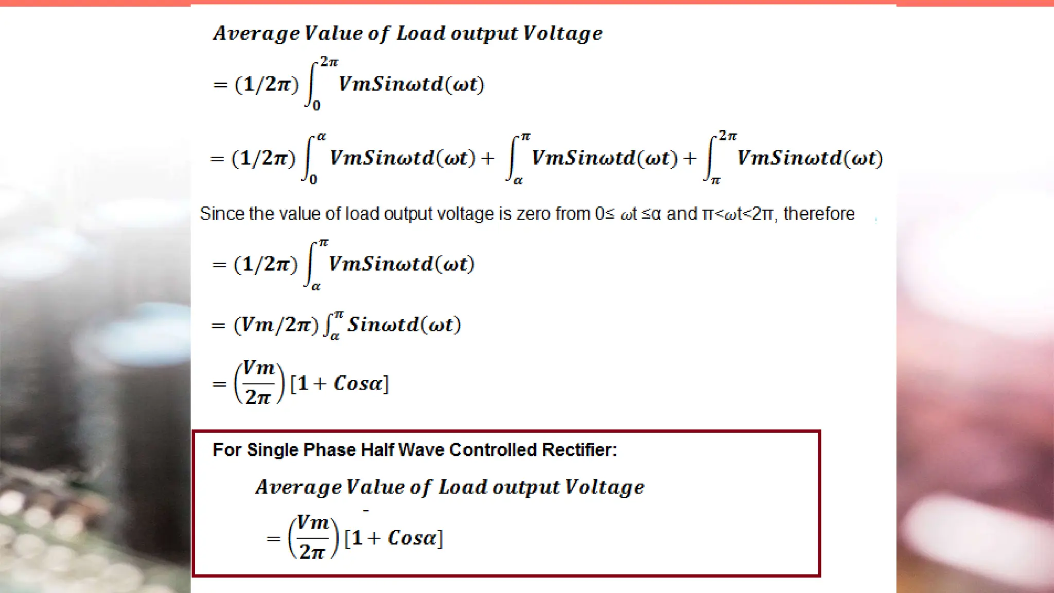 3. At α = 90°, the average output voltage is equal to zero as the area under the positive and the negat