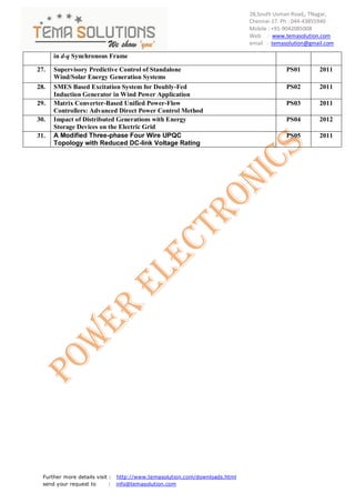 The document appears to be from Tema Solution, providing their contact information and listing 31 power electronics projects from 2012-2011. It includes the project title, code, and year for each project focused on topics like renewable energy, energy storage, grid integration, and power quality compensation technologies. More details on the projects can be found on Tema Solution's website by contacting them.