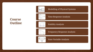 The document provides an overview of control systems, including definitions, classifications (linear vs non-linear, open loop vs closed loop), and key components like controllers and feedback mechanisms. It elaborates on various methodologies for modeling these systems mathematically, such as transfer functions and time response analysis. Additionally, it discusses the dynamic and static responses of mechanical systems, along with the electrical analogies used in their analysis.
