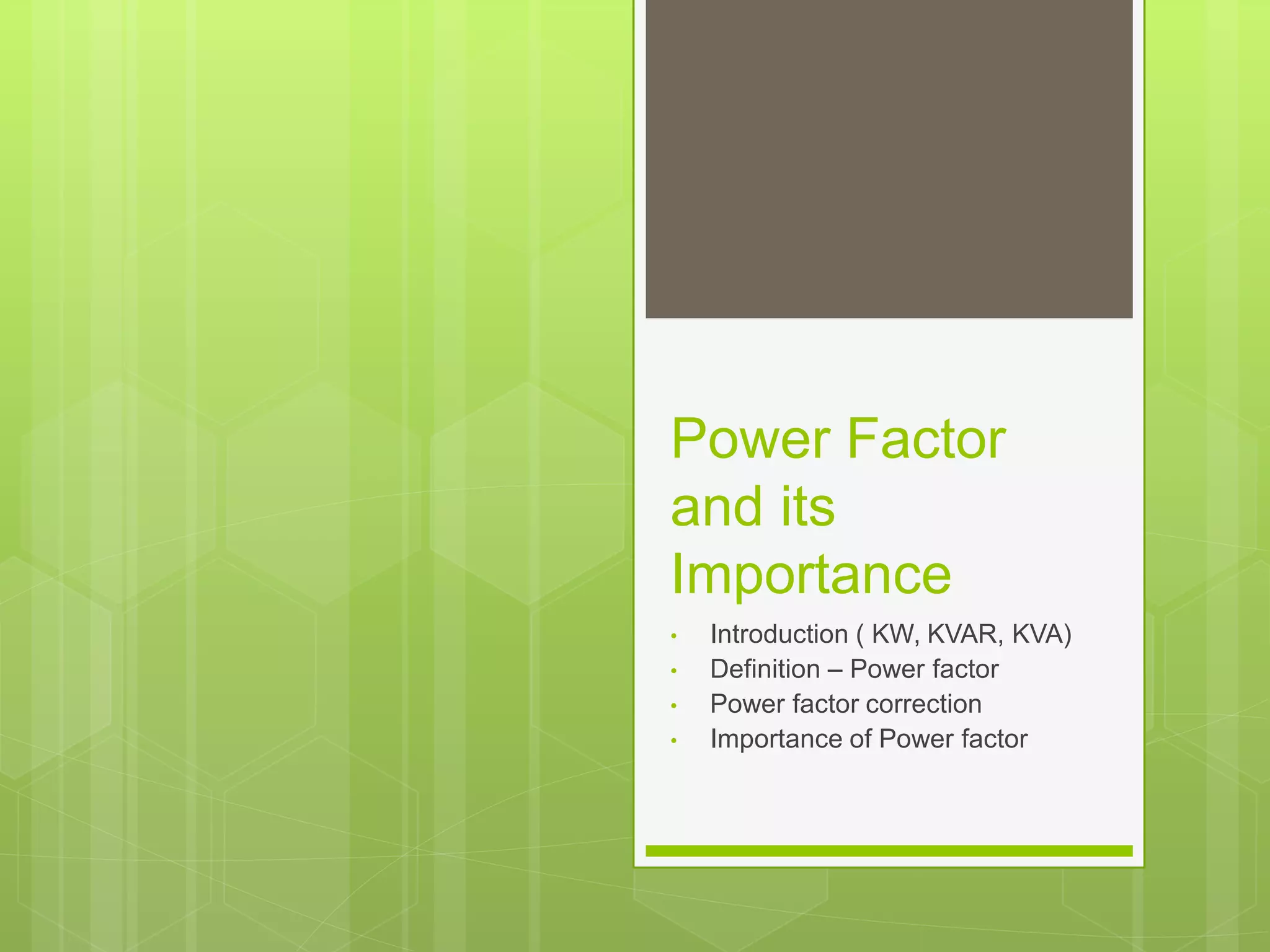 The document explains the concept of power factor, defined as the ratio of working power (kw) to apparent power (kva), and how it is affected by reactive power (kvar) from inductive loads. It outlines the benefits of improving power factor, such as reduced utility fees and increased system capacity, and discusses methods for correction, including the installation of capacitors and operating motors efficiently. A power factor close to unity is essential for electric utilities to minimize losses and avoid penalties for industrial facilities.