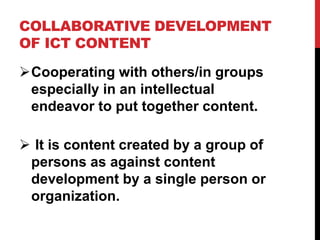Collaborative development of ICT content refers to content created by a group of people rather than a single person. Effective collaboration requires tools that facilitate communication between culturally diverse virtual and hybrid teams. Popular online collaborative tools include email, workflow software, online workspaces, and project management systems. Content management systems are also useful for indexing, searching, and revising digital content. Curating existing information into a coherent theme is another important part of developing ICT content.