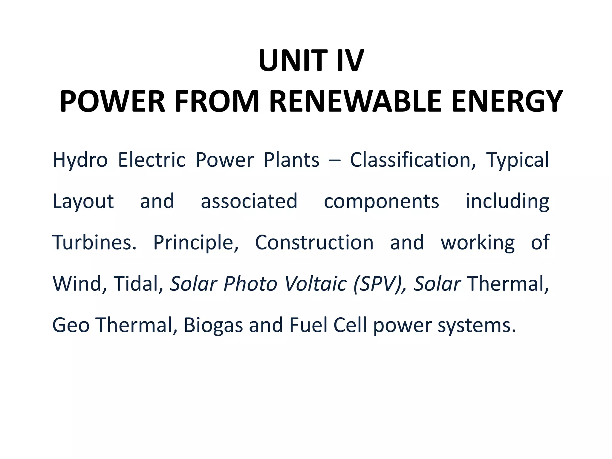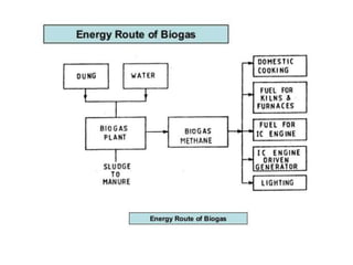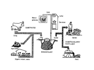 This document summarizes different renewable energy sources including hydroelectric, wind, tidal, solar photovoltaic, solar thermal, geothermal, and biogas power systems. For hydroelectric power, it describes the basic components and layout of hydroelectric dams as well as how water is used to spin turbines and generate electricity. For wind power, it discusses how wind turbines convert kinetic energy from the wind into electrical energy. It also summarizes the basic components and functioning of tidal, solar photovoltaic, solar thermal, geothermal, and biogas power generation systems.