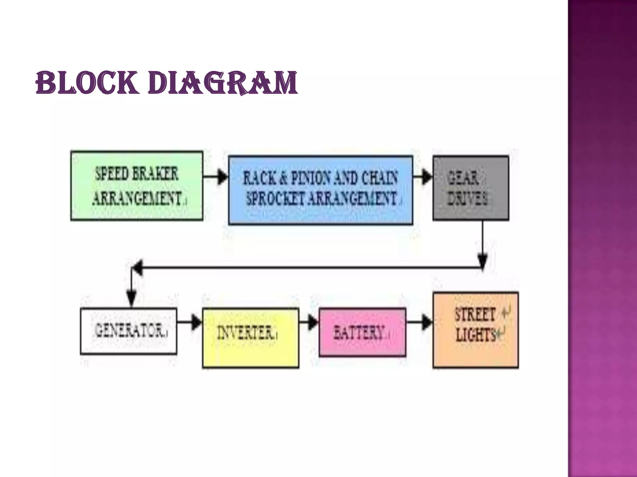 This document describes a design for a speed bump that generates electricity from the kinetic energy of passing vehicles. It discusses two mechanisms - a spring coil mechanism and rack pinion mechanism - that use vehicles compressing the speed bump to power an electrical generator. The spring coil mechanism uses compressed air from the speed bump to power an air turbine connected to the generator. The design aims to reduce wasted energy from vehicles braking at speed bumps and provide a small amount of renewable energy.