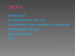 Introducció La influènciaen els nins La informació que ens dona la publicitat Diferenciació sexual Responsabilitat Rols