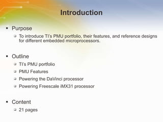 The document introduces Texas Instruments' Power Management Units (PMUs) designed for various embedded microprocessors, detailing their features and reference designs. It highlights benefits such as space savings, lower costs, and high efficiency at light loads, while also discussing integration advantages and disadvantages. Specific PMUs like the TPS650240 for the Freescale IMX31 processor are covered, along with evaluation modules and contact information for ordering and support.