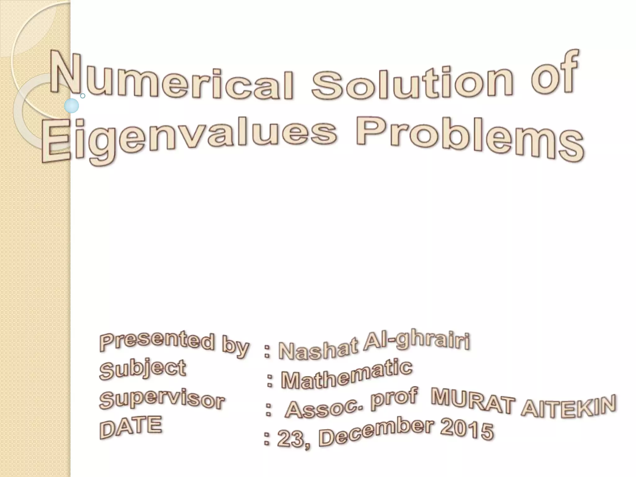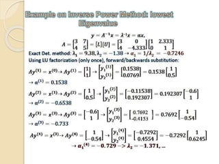 The document discusses eigenvalue problems and algorithms for solving them. Eigenvalue problems involve finding the eigenvalues and eigenvectors of a matrix and occur across science and engineering. The properties of the eigenvalue problem, like whether the matrix is real or complex, affect the choice of algorithm. The Power Method is described as an iterative technique for determining the dominant eigenvalue and eigenvector of a matrix. It works by successively applying the matrix to a starting vector to isolate the component in the direction of the dominant eigenvector. Variants can find other eigenvalues like the smallest. General projection methods approximate eigenvectors within a subspace, while subspace iteration generalizes Power Method to compute multiple eigenvalues.