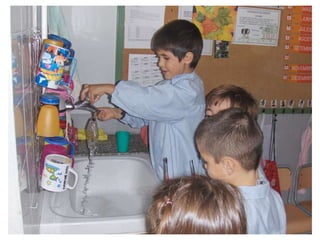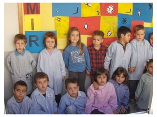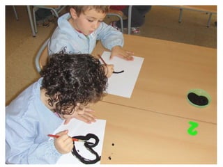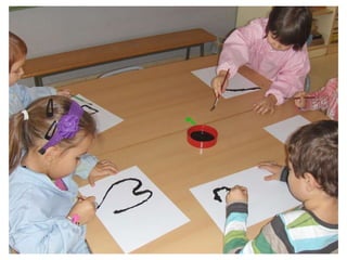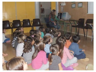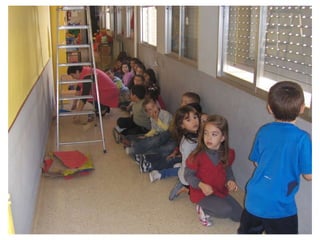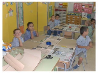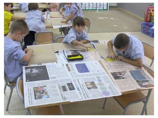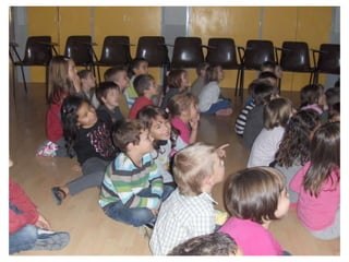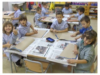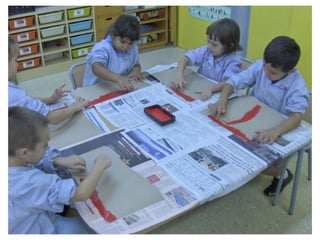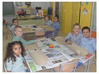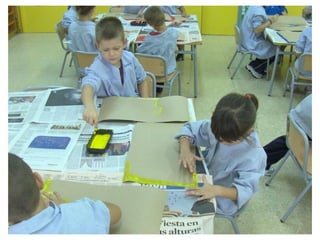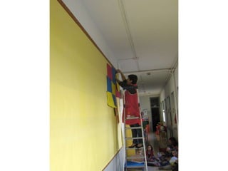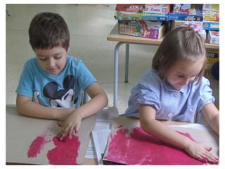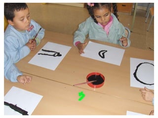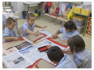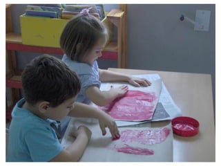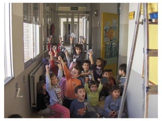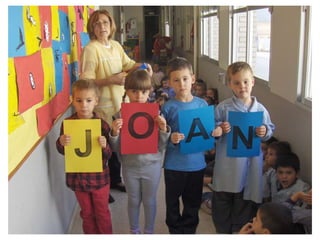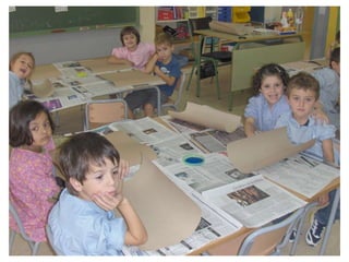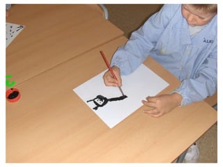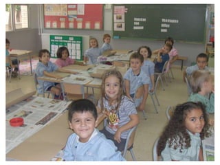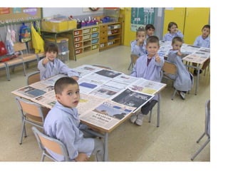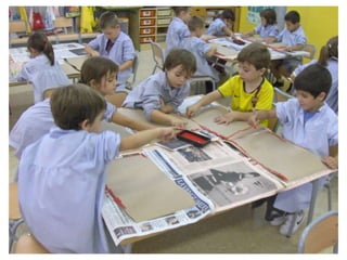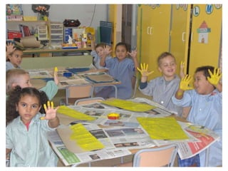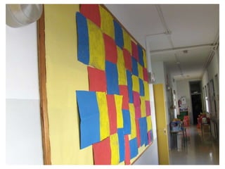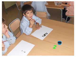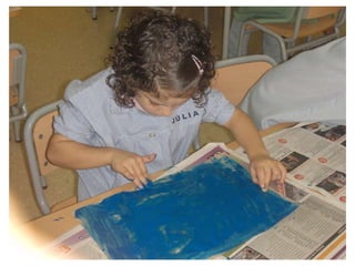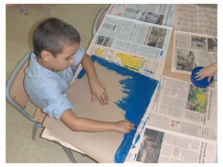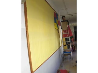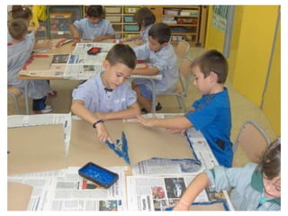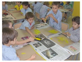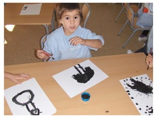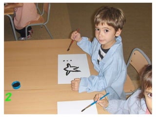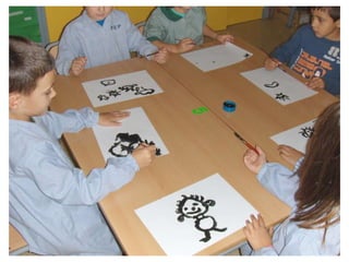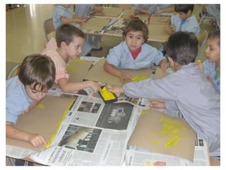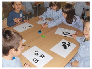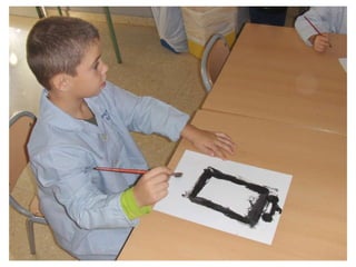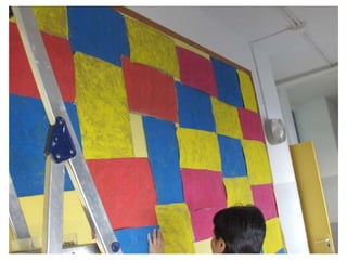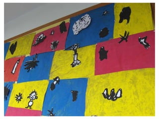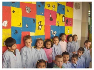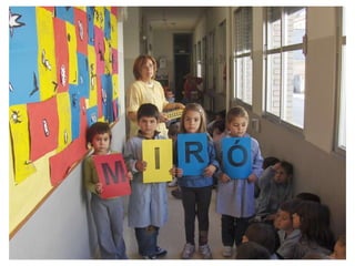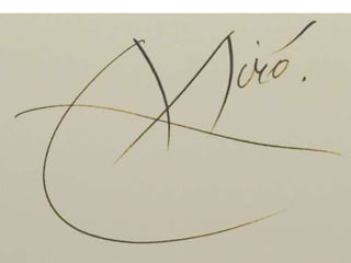 The document discusses learning about Joan Miró's techniques and works, preparing to paint like him, and creating a mural. Students learned about Miró's symbols, began the first part of a mural project using those symbols, and finally completed the mural at the end of the project.