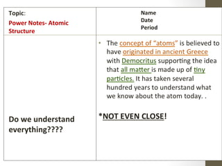 This document provides an overview of the history and development of atomic structure and the atomic model. It discusses early Greek philosophers like Democritus who proposed that all matter is made of invisible indivisible particles called atoms. It then summarizes key discoveries and models proposed by scientists like Dalton, Thomson, Rutherford, Bohr, Schrodinger that refined our understanding of atomic structure, such as discovering the electron, proposing the planetary model of electrons orbiting the nucleus, and the wave mechanical model. The document also defines the basic subatomic particles of protons, neutrons and electrons, isotopes, and provides examples of how atomic mass and ions are related to atomic structure.