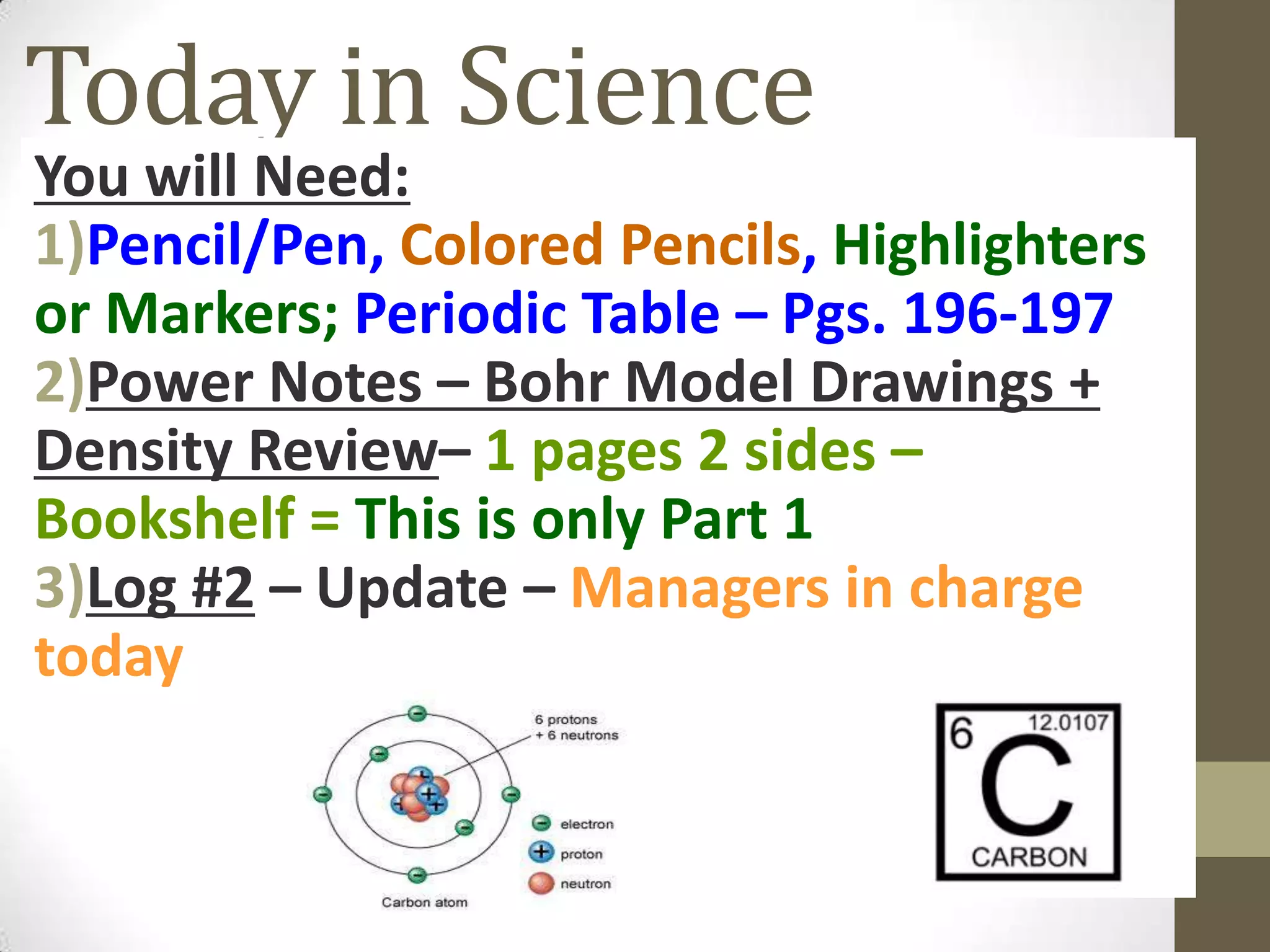 1. A list of materials needed for the lesson including a pencil, periodic table, and power notes.