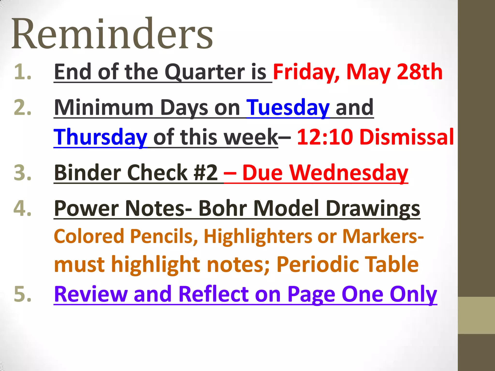 2. Reminders about due dates for assignments including a binder check, minimum days, and the end of the quarter.