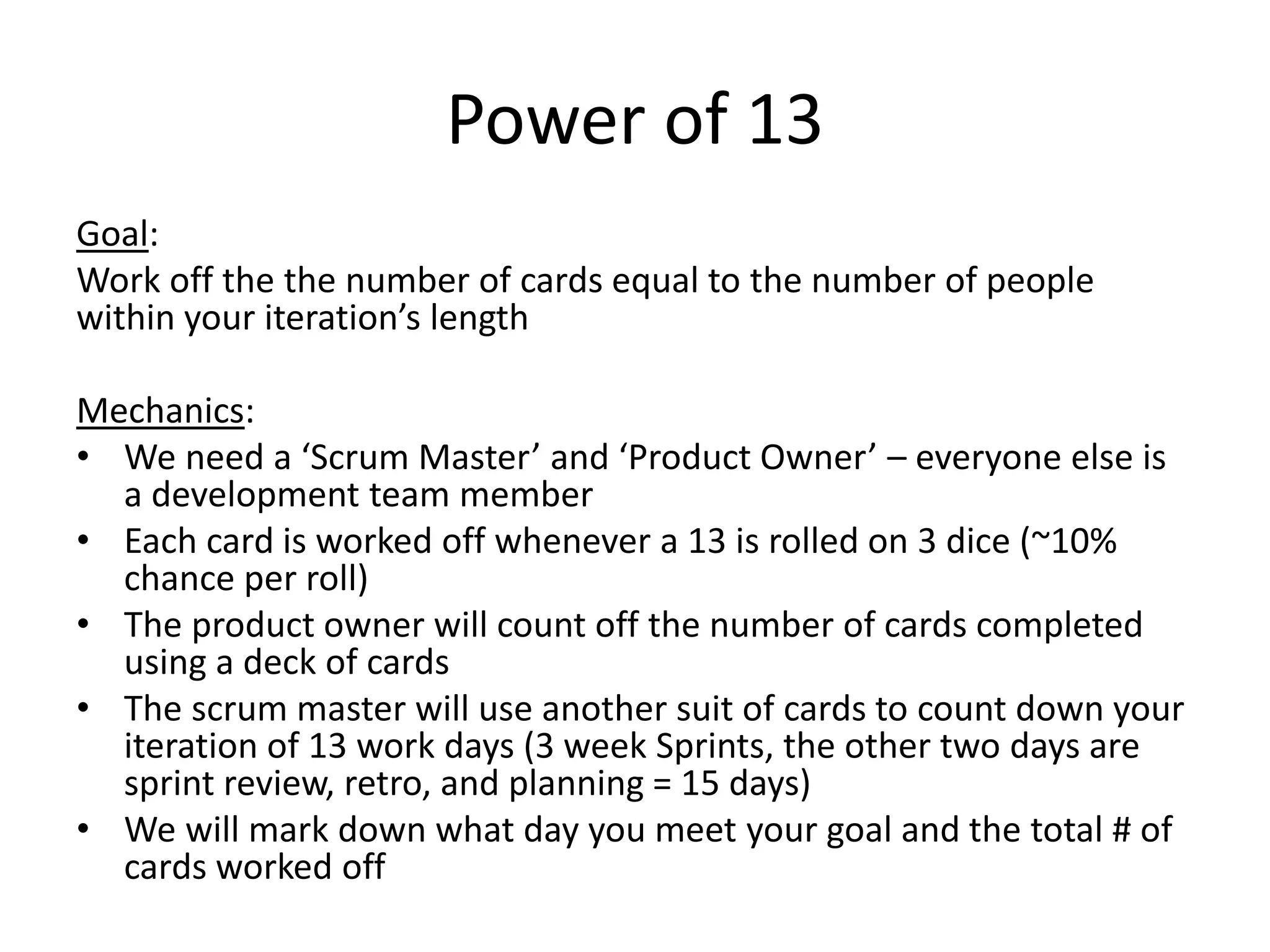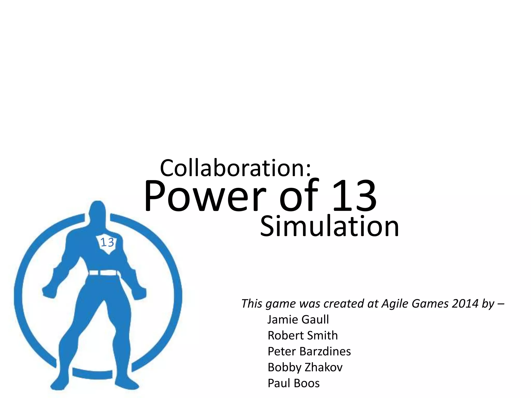 The 'Power of 13' simulation, created at Agile Games 2014, is designed to illustrate various collaborative development scenarios through rounds that mimic different work styles: individual silos, pulling work, pairing, and swarming. Each round utilizes dice rolls to determine card completion, with developers working both independently and in groups to enhance coordination and efficiency. The simulation concludes with a debrief to reflect on the outcomes and effectiveness of collaboration in each round.