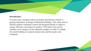 This study examines the use of CFD simulation to enhance ventilation systems in industrial buildings for improved air quality and energy efficiency. It analyzes different ventilator types and configurations to optimize occupant comfort, temperature control, and air changes per hour. The findings underscore the importance of CFD in designing cost-effective, energy-efficient manufacturing units while addressing the growing concerns of indoor air quality and thermal comfort.