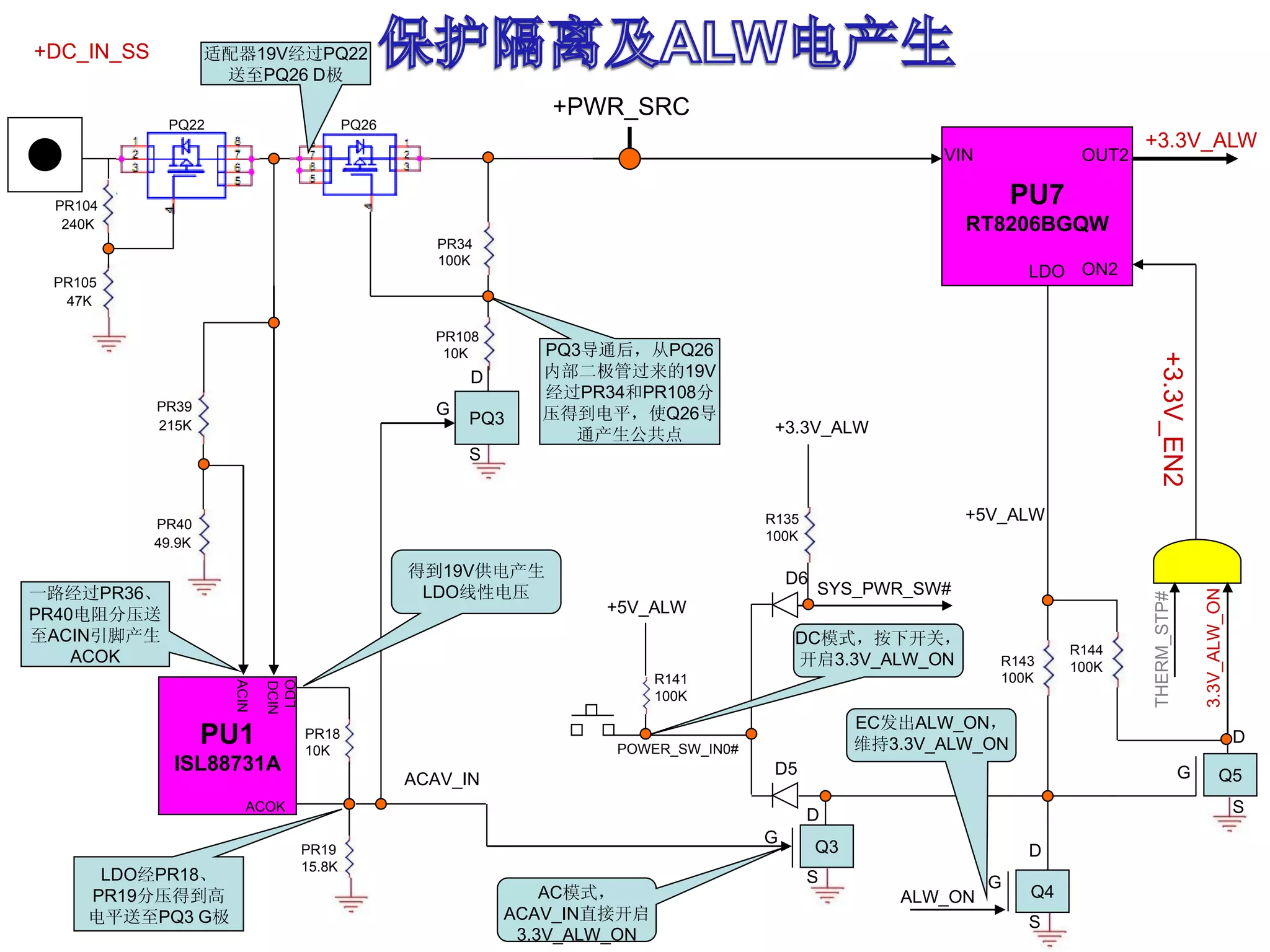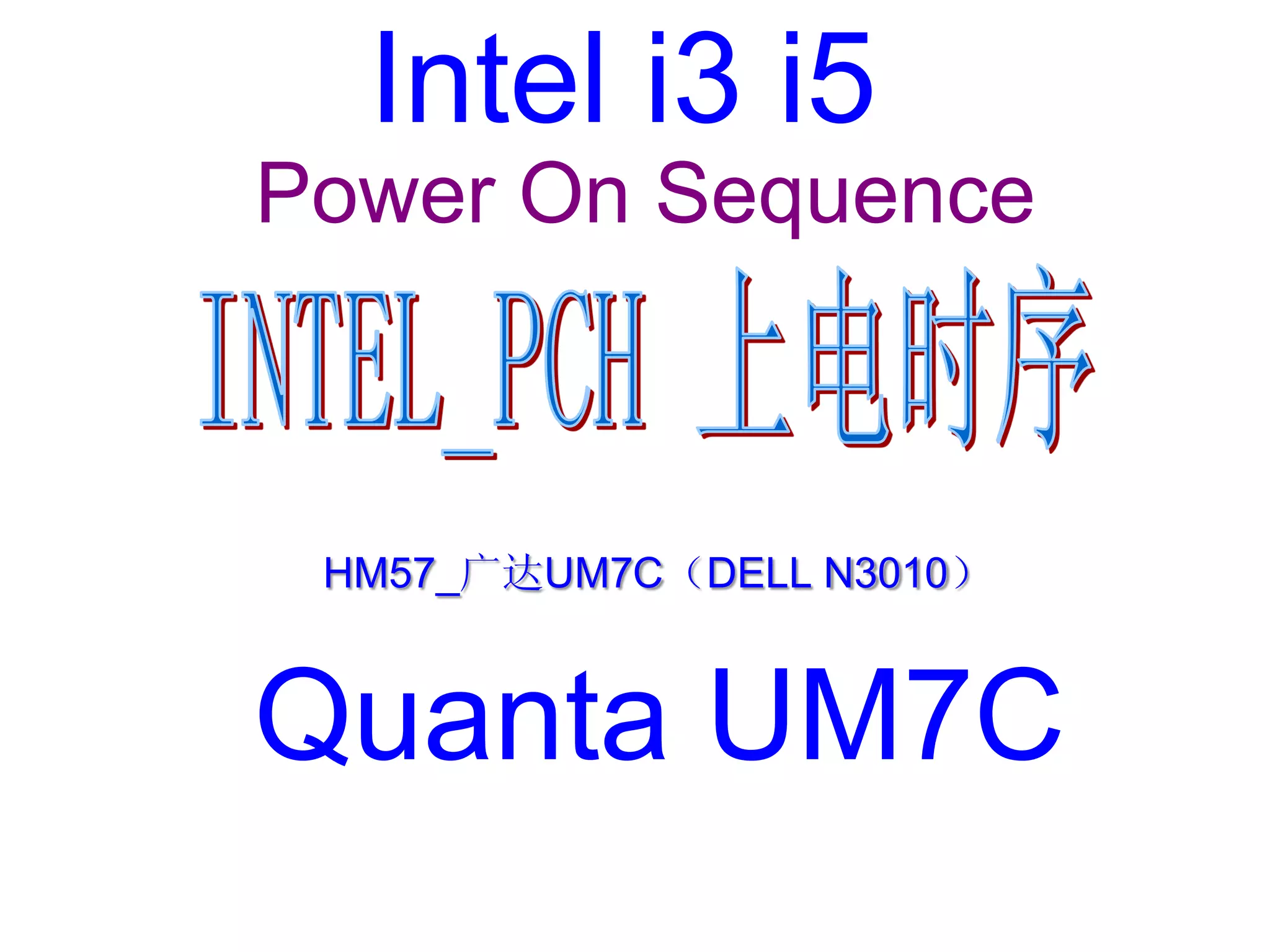 该文档描述了广达UM7C(Dell N3010)的电源开启序列,涉及多个电阻和电压信号的分压和级联过程。文档详细列出了电源管理组件和信号流程,包括AC/DC模式的切换和各种电压电平的生成。整体内容涉及硬件电路设计与电源管理的技术细节。