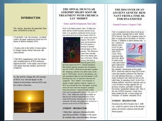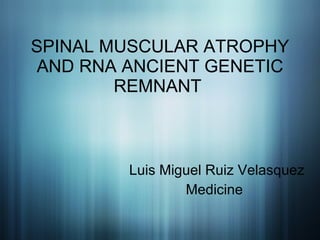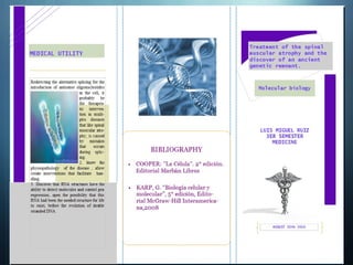 Spinal muscular atrophy is a neuromuscular disease caused by a genetic mutation that results in a lack of the survival motor neuron protein. The disease leads to degeneration of motor neurons and muscle atrophy. A potential new treatment involves using antisense oligonucleotides to modify gene splicing and increase production of the survival motor neuron protein in motor neurons. RNA structures were likely important before the evolution of DNA as some bacteria have RNA sensors that control gene expression. Discovering these ancient RNA remnants helps understand evolutionary relationships between species. Redirecting alternative splicing through antisense oligonucleotides could treat diseases caused by splicing errors like spinal muscular atrophy.