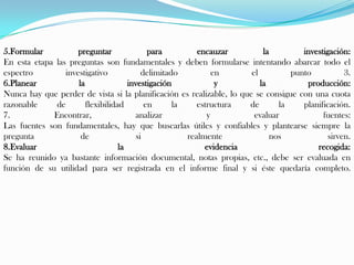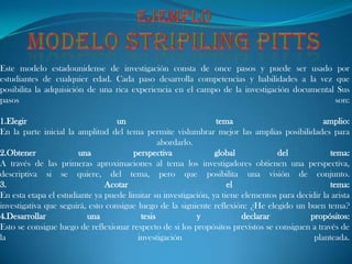 Este modelo de investigación consta de 11 pasos que guían a los estudiantes en el proceso de investigación. Los primeros pasos incluyen elegir un tema amplio sobre la naturaleza, obtener una perspectiva global del tema, y acotar el tema a estudiar. Luego, los estudiantes desarrollan una tesis, formulan preguntas de investigación, y planifican la investigación. Los pasos siguientes implican encontrar y analizar fuentes, evaluar la evidencia, establecer conclusiones, y crear un producto final. El último paso involucra