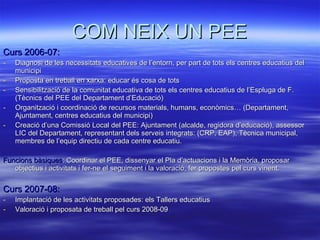 COM NEIX UNPEE Curs 2006-07: Diagnosi de les necessitats educatives de l’entorn, per part de tots els centres educatius del municipi Proposta en treball en xarxa: educar és cosa de tots Sensibilització de la comunitat educativa de tots els centres educatius de l’Espluga de F. (Tècnics del PEE del Departament d’Educació) Organització i coordinació de recursos materials, humans, econòmics… (Departament, Ajuntament, centres educatius del municipi) Creació d’una Comissió Local del PEE: Ajuntament (alcalde, regidora d’educació), assessor LIC del Departament, representant dels serveis integrats: (CRP, EAP), Tècnica municipal, membres de l’equip directiu de cada centre educatiu. Funcions bàsiques : Coordinar el PEE, dissenyar el Pla d’actuacions i la Memòria, proposar objectius i activitats i fer-ne el seguiment i la valoració, fer propostes pel curs vinent. Curs 2007-08: Implantació de les activitats proposades: els Tallers educatius Valoració i proposata de treball pel curs 2008-09