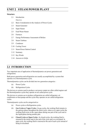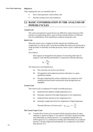This document describes the ideal Rankine cycle, which is the thermodynamic cycle that forms the basis for steam power plants. It consists of four processes: 1) isentropic compression of water in a pump, 2) constant pressure heat addition to produce high-temperature, high-pressure steam in a boiler, 3) isentropic expansion of the steam in a turbine to produce work, and 4) constant pressure heat rejection in a condenser to return the steam to liquid water. The Rankine cycle is the idealized model that closely approximates the actual thermodynamic cycle used in steam power plants to convert heat into useful work.