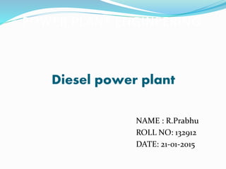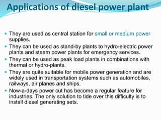 This document discusses the applications and layout of a diesel power plant. It describes how diesel power plants can be used as central stations for small or medium power supplies, as stand-by plants for hydroelectric or steam plants, and as peak load plants. It also notes their use for mobile power generation. The major systems of a diesel power plant are then outlined, including the engine, starting, lubrication, fuel, air, cooling, exhaust, and governing systems. Advantages like compact size and quick start up are contrasted with disadvantages like high fuel and maintenance costs.