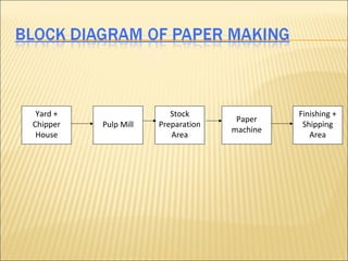 The document describes the instrumentation and process control systems used at a pulp and paper mill. It discusses the various measurement devices such as level transmitters, pressure transmitters, and flow transmitters. It also describes the control systems that regulate processes like stock preparation, quality control, boiler operations, and turbine generation. The calibration and maintenance of instruments is conducted according to ISO standards to ensure accuracy of measurements.