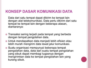 Dokumen ini membahas konsep dasar komunikasi data, termasuk elemen-elemen penting seperti sumber data, media transmisi, dan penerima. Terdapat berbagai jenis media transmisi, sistem komunikasi, dan perangkat keras yang digunakan dalam proses pengiriman data, dengan perhatian pada efisiensi dan reliabilitas. Berbagai aplikasi sistem komunikasi data juga diuraikan untuk menunjukkan penggunaan dan manfaatnya.