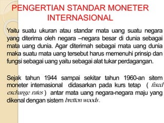 Dokumen ini membahas sistem moneter internasional, yang mencakup pengertian standar moneter, sejarah sistem Bretton Woods, dan kemunculan euro di Eropa. Selain itu, bertumpu pada teori permintaan uang klasik dan Keynes, dokumen ini menyelidiki nilai uang serta hubungan antara penawaran uang dan nilai uang. Teori Keynes menekankan bahwa uang berfungsi tidak hanya sebagai alat transaksi tetapi juga sebagai penyimpan nilai.
