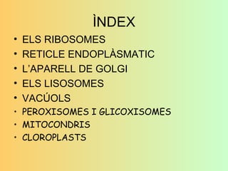 ÌNDEX ELS RIBOSOMESRETICLE ENDOPLÀSMATIC L’APARELL DE GOLGI ELS LISOSOMES VACÚOLS PEROXISOMES I GLICOXISOMES MITOCONDRIS CLOROPLASTS