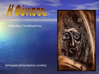 Η οπτική τουφύλου στο έργο του Παπαδιαμάντη Μεγάλη έκταση στο έργο του Αλέξανδρου Παπαδιαμάντη κατέχει το πρόβλημα της θέσης της γυναίκας στην ελληνική κοινωνία. Ο «αναχωρητής», ο «κοσμοκαλόγερος», όπως αρέσκονται να αποκαλούν τον Παπαδιαμάντη, προβάλλει από το έργο του σαν ο πιο θερμός συνήγορος και υπερασπιστής των κοινωνικών δικαιωμάτων της Ελληνίδας. Το έργο του αποτέλεσε, μάλιστα, σημαντική πηγή πληροφοριών για τις συνθήκες ζωής των γυναικών του 2ου μισού του 19ου αιώνα.