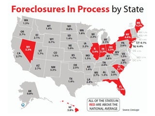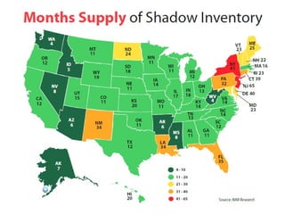 The document summarizes housing market trends in early 2012. It shows that existing home sales remain strong with over 12,500 homes sold daily. Pending home sales and monthly inventory levels are improving. Mortgage rates are near all-time lows and home prices are expected to continue declining in 2012 as the large shadow inventory of distressed homes works through the system, pushing up short sales and foreclosures. However, projections call for a gradual, steady recovery in the housing market supported by job growth and low interest rates.