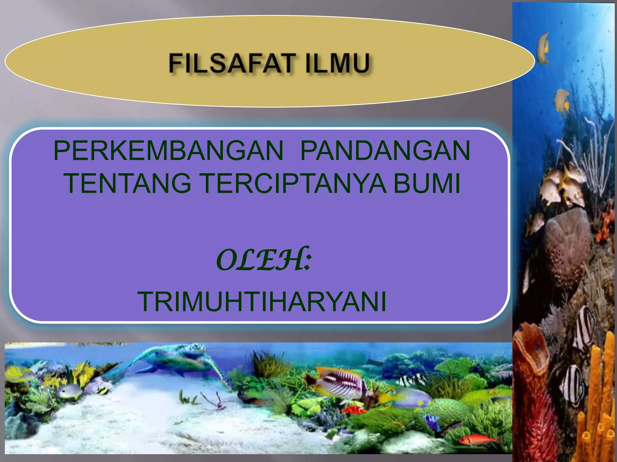 Makalah ini membahas perkembangan pandangan tentang terciptanya bumi, mulai dari pendapat bangsa Babilonia, Yunani, kitab Kejadian, Al-Quran, hingga berbagai teori pembentukan bumi dan usia bumi. Teori terkenal meliputi teori kabut Kant-Laplace, planetesimal, bintang kembar, pasang surut gas, dan Big Bang. Usia bumi diperkirakan antara 5-7 miliar tahun berdasarkan perhitungan radioaktivitas.