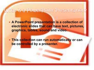 PowerPoint presentations allow users to create digital slideshows containing text, images, videos and other media that can be displayed automatically or manually by a presenter. Slide layouts, themes, templates and other design elements help structure the content and ensure visual consistency. Presenters can add notes, animations, graphics and other elements to engage audiences.