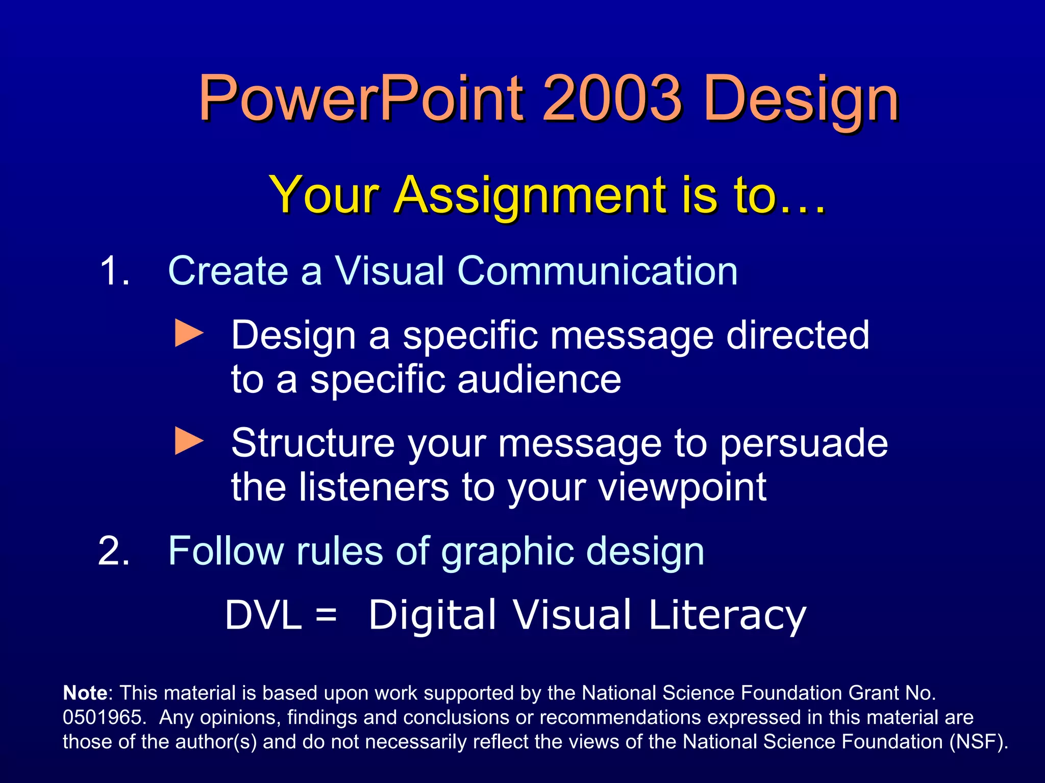 The document provides guidance on designing effective PowerPoint presentations, including structuring the message, following design principles, selecting themes, fonts, images and using animation sparingly. It emphasizes practicing the presentation to ensure successful delivery that engages the audience.