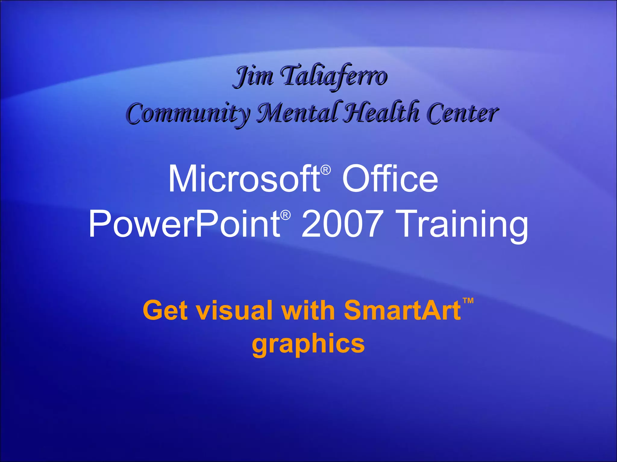 The document provides training on using SmartArt graphics in Microsoft PowerPoint 2007. It discusses the different types of SmartArt layouts including lists, processes, hierarchies, and relationships. It also explains how to create SmartArt graphics by converting existing lists or starting with a blank graphic and adding text. The document covers manipulating text and shapes within SmartArt graphics.