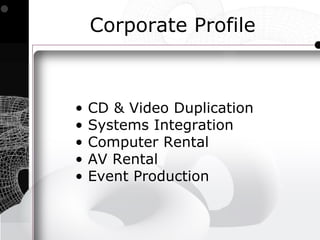 A&V Company provides audio/visual and event production services including CD and video duplication, systems integration, computer and AV equipment rental, and event production. They have offices located at the Grandover Resort & Conference Center and Sheraton Four Seasons Koury Convention Center. Their services division provides comprehensive staging and presentation services using video/audio equipment and lighting for corporate and sporting events.