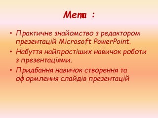 редактор презентації в Power point 2010 1. 2. Мета :