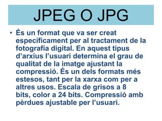JPEG O JPGÉsun format que va ser createspecíficament per al tractament de la fotografía digital. En aquesttipusd’arxiusl’usuari determina el grau de qualitat de la imatgeajustant la compressió. És un delsformatsmésestesos, tant per la xarxacom per a altres usos. Escala de grisos a 8 bits, color a 24 bits. Compressióambpèrdues ajustable per l’usuari.