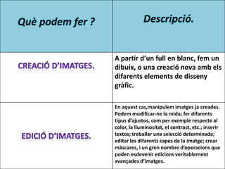 BMPMapa de bits.És el formatestàndardd’imatge de windows. Encara que les imatges ocupen moltd’espai, té l’aventatge que no perdenqualitat encara que es manipulinmoltesvegades. Té una profunditat de color de 24 bits i es pot comprimir sensepèrdues.