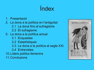 Índex Presentació Ladona a la política en l’antiguitat 2.1 La dona fins al sufragisme 2.2 El sufragisme La dona a la política actual 3.1 Enquestes 3.2 Estadístiques 3.3 La dona a la política al segle XXI. 3.4 Entrevistes Líders polítics femenins Conclusions