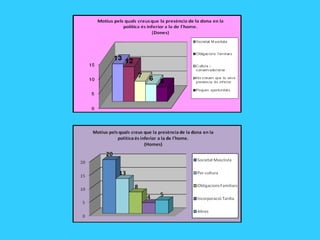 Taules sobre lapresència de la dona a la política Quantes dones tenen presència política al Parlament de Catalunya? Legislatura Nombre Percentatge (%) 1999 – 2003 37 27,4 2003 – 2006 43 30,4 2006 – 2010 48 35,6
