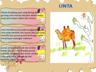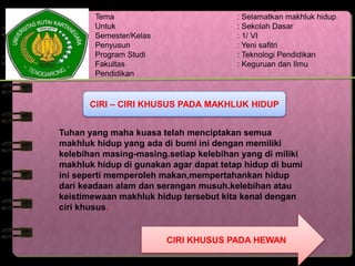 Dokumen ini membahas ciri khusus dari berbagai makhluk hidup yang membantu mereka bertahan di lingkungan mereka. Contohnya, unta memiliki punuk untuk menyimpan cadangan makanan, cicak dapat memutuskan ekornya untuk melindungi diri, dan kelelawar menggunakan ekolokasi untuk mendeteksi lingkungan mereka. Materi ini ditujukan untuk siswa sekolah dasar pada tema menyelamatkan makhluk hidup.