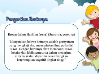 Dokumen ini membahas pentingnya bertanya dalam proses pembelajaran yang dapat meningkatkan keterampilan kognitif siswa. Bertanya juga meningkatkan partisipasi, minat, dan perhatian siswa, serta memfasilitasi pola pikir aktif. Berbagai jenis pertanyaan diuraikan berdasarkan maksud, taksonomi Bloom, dan luas sempitnya pertanyaan.