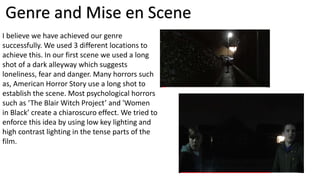 Our film involves the death of a main character. We use various film techniques like lighting, camera angles, and editing to create tension and move the psychological horror plot. Several scenes take inspiration from other horror films to frighten the audience, such as using a long shot in a dark alleyway and having lights switch off down a street. Fast-paced editing, unexpected sounds, and a fade to black with a knife sound keep viewers on edge. Titles are in bright white font for visibility against the low-key lighting of tense scenes.