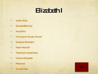 The document is an interactive PowerPoint project about the life of Queen Elizabeth I of England. It covers her family background including her parents King Henry VIII and Anne Boleyn. It discusses her difficult childhood after her mother was executed. It also summarizes how Elizabeth brought religious peace and prosperity to England during her 44 year reign, before concluding with resources for further information.