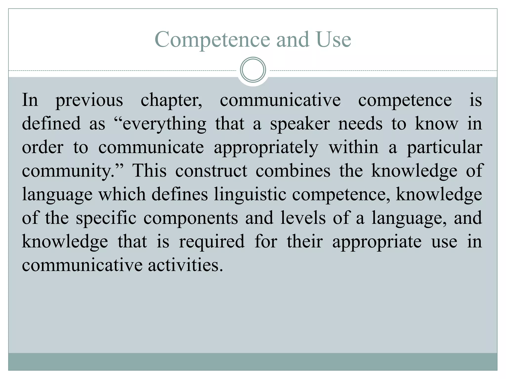 This document discusses the different types of knowledge and competencies required for second language use. It distinguishes between academic competence, which prioritizes reading, listening and writing skills, and interpersonal competence, which prioritizes listening and speaking skills. The document outlines the components of language knowledge including vocabulary, morphology, phonology, syntax and discourse. It explains how these different components relate to academic versus interpersonal language use.