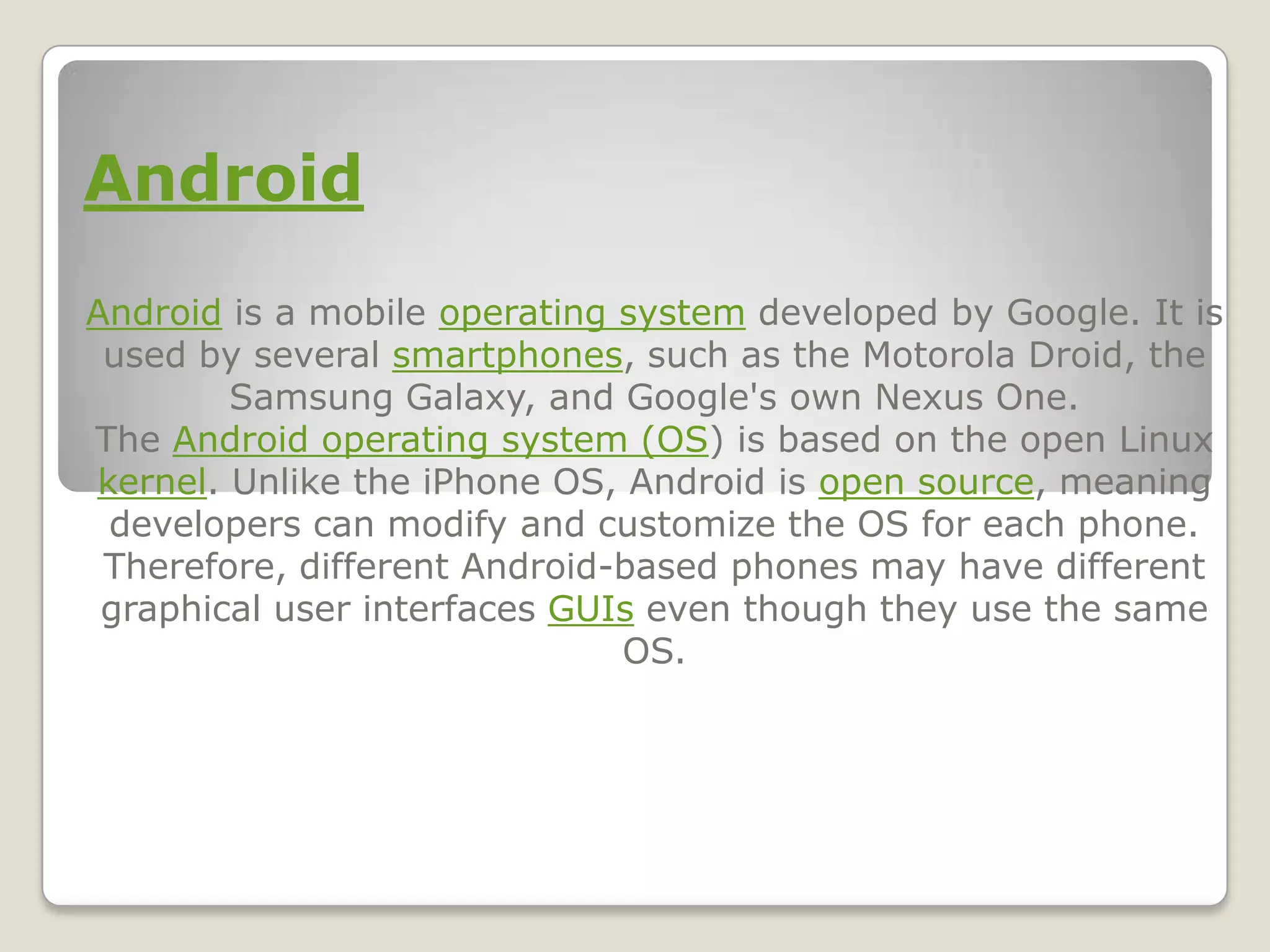 Android is an open source, Linux-based operating system for mobile devices like smartphones and tablets. It was developed by Android Inc, which was acquired by Google in 2005. The Android platform allows device manufacturers and developers to modify and customize the OS. It has a large community of developers writing applications and has become the world's most widely used smartphone platform, with over 75% market share. Key features include support for connectivity technologies, messaging, multiple languages, web browsing, media playback, and Bluetooth connectivity.