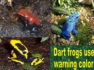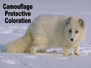 This document discusses various animal adaptations that help animals survive in the wild. It describes structural adaptations like fins and teeth that are body parts aiding survival. Behavioral adaptations are actions like clown fish seeking shelter with sea anemones. Physiological adaptations are internal processes like bears hibernating or dolphins being able to hold their breath for long periods. Learned behaviors are ways animals have adapted to changed environments caused by human activity. Camouflage and coloration can also help animals hide from predators or warn others of their toxicity.