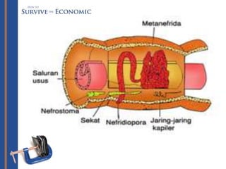 Dokumen ini membahas tentang kelompok hewan invertebrata annelida, termasuk klasifikasi, ciri-ciri, dan sistem tubuhnya. Annelida memiliki struktur tubuh bersegmen, sistem pencernaan yang lengkap, serta mekanisme reproduksi hermaprodit dan seksual. Selain itu, dokumen ini juga menjelaskan peranan annelida dalam ekosistem dan manfaatnya bagi manusia, termasuk dalam bidang kesehatan.