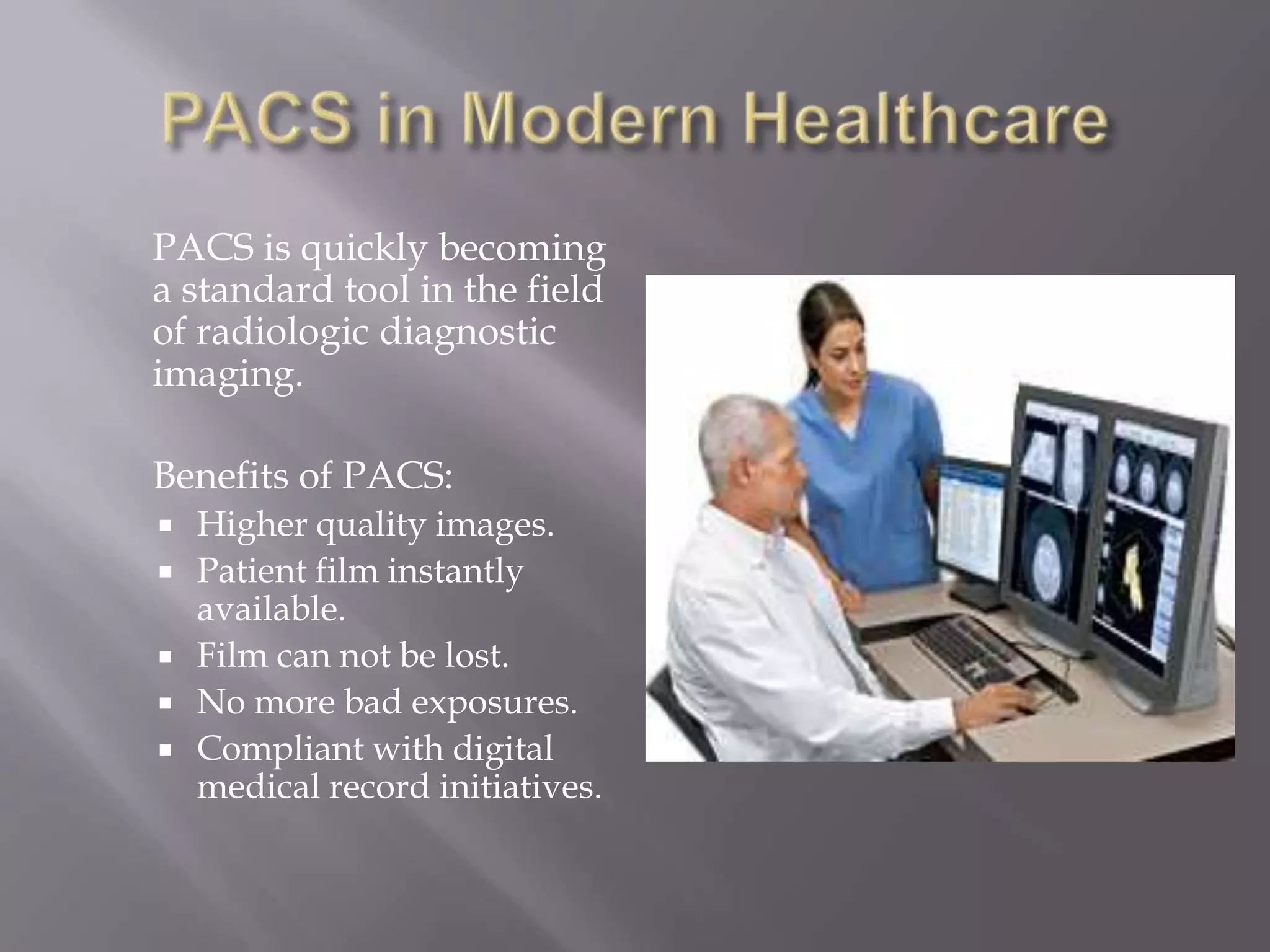 PACS (Picture Archive Communication System) is becoming a standard tool in radiology for storing and viewing digital medical images. It provides benefits like higher quality images, instant access to patient films from any location, and integration with digital medical records. PACS acquires images directly from medical equipment, stores them in a database, and allows viewing through workstations. It replaces physical film with a digital system for more efficient sharing of images between radiology staff and physicians.