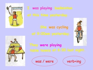 The document explains the use of the past continuous tense to describe actions occurring at specific times in the past. It provides examples of this tense in various contexts, including simultaneous actions and shorter actions within longer ones. Additionally, it incorporates a mystery narrative, asking readers to identify a murderer based on alibis involving the past continuous tense.