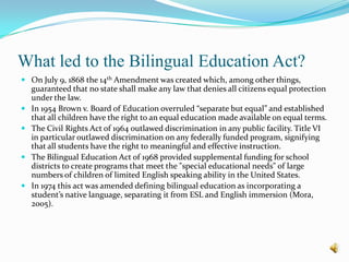 The document discusses the history and ongoing debate around bilingual education in the United States. It provides background on laws like the Bilingual Education Act of 1968 and studies that have compared student outcomes in bilingual programs versus English-only approaches. The research and conclusions presented in the studies reviewed in the document come to differing determinations on the effectiveness of bilingual education, with some finding positive impacts and others finding lower academic performance compared to English-immersion.