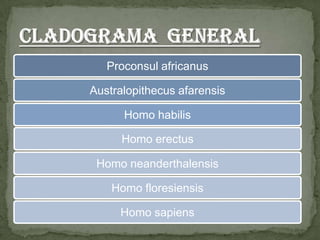 AustralopithecusafricanusÉs un homínidque va viure fa 3,3 i 2,4 milions d’anys a l’Àfrica oriental i meridionalCarácterístiques físiques: l'australopithecusafricanus té un crani més globular que Australopithecusafarensis, la capacitat craneal era d’uns 440 cm ³.Eren bípedes però amb els braços més llargs que les cames.
